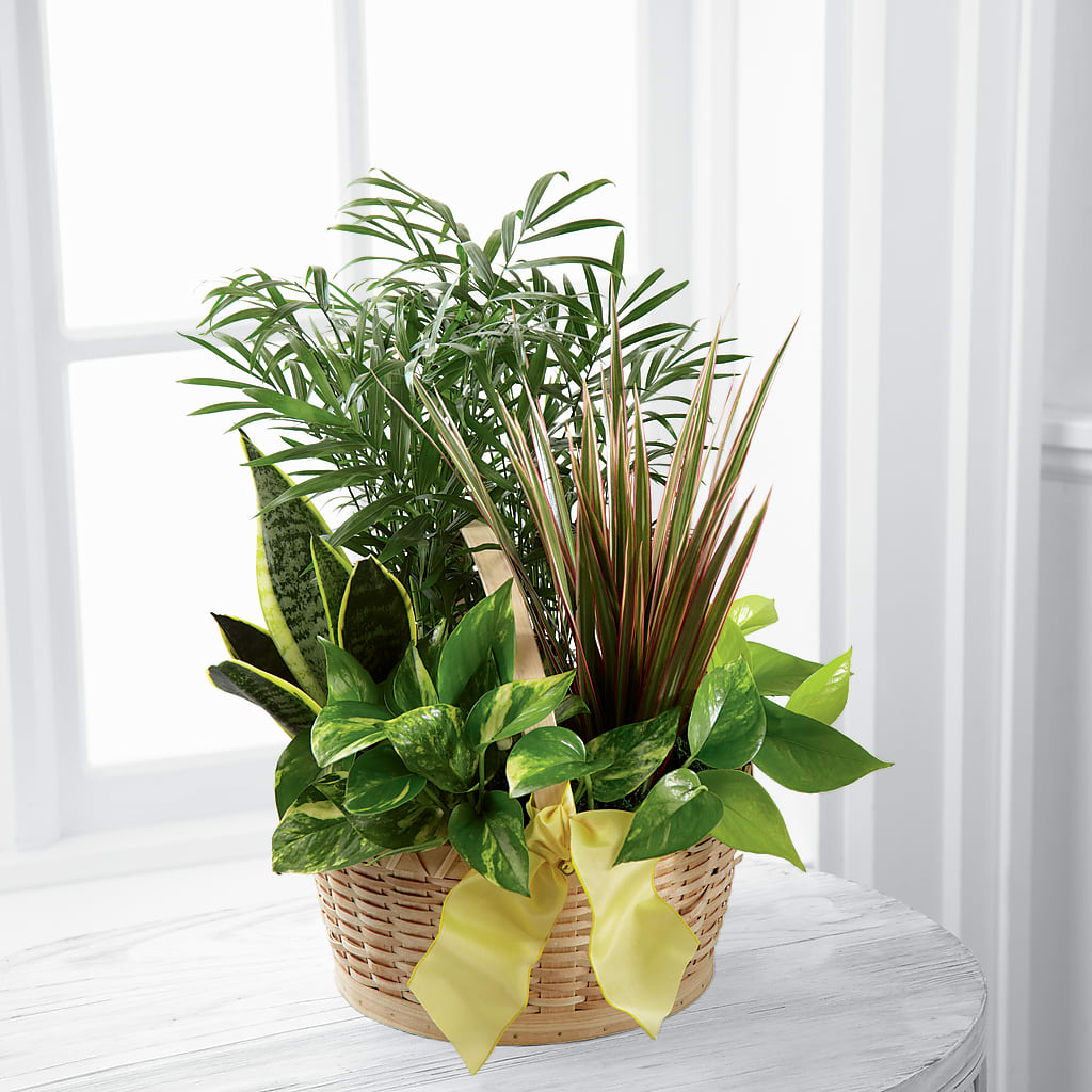 Our French Garden planter employs lush, green plants to create a gift ideal for any of life's special occasions. Containing a varied assortment of 6 green plants, this dish garden arrives presented in a natural round woodchip basket accented with a yellow wired taffeta ribbon to create a wonderful way to send your sentiments across the miles.